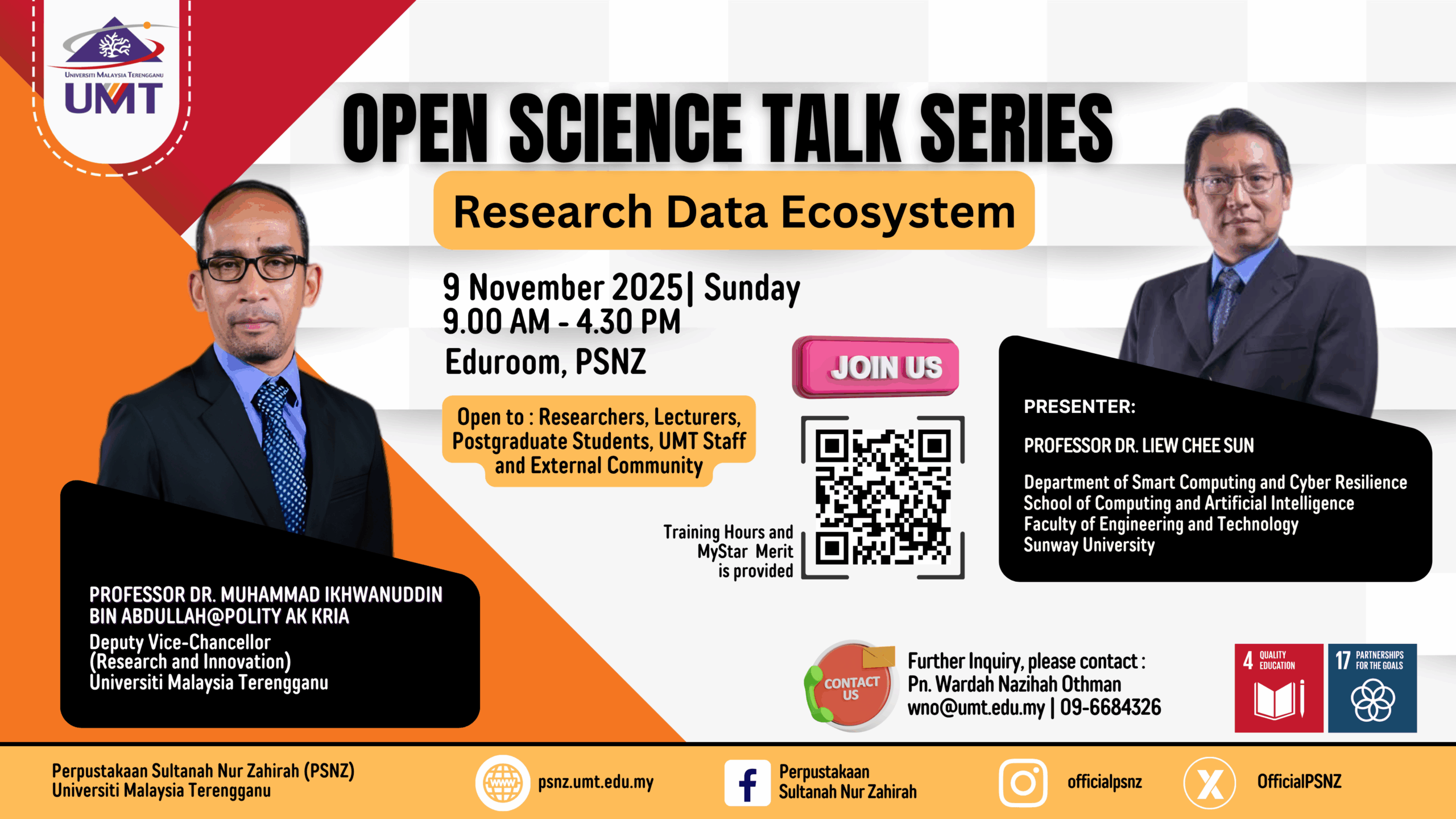 Sukacita dimaklumkan bahawa Perpustakaan Sultanah Nur Zahirah (PSNZ) di bawah Jawatankuasa Penggerak Kapasiti dan Kesedaran, Sains Terbuka UMT akan menganjurkan program Open Science Talk Series yang bertajuk “Reseach Data Ecosystem” khusus untuk warga UMT serta komuniti luar. Maklumat program sebagaimana berikut: