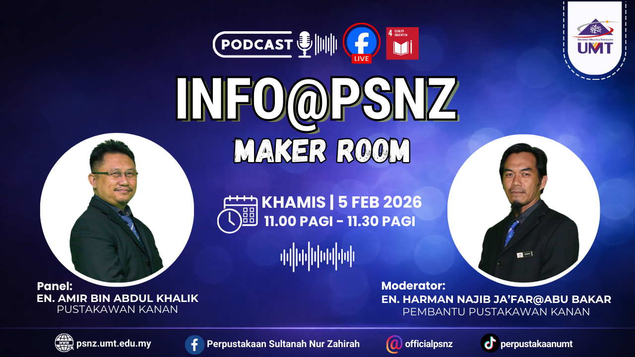 Dengan segala hormatnya perkara di atas dirujuk.2. Sukacita dimaklumkan bahawa Perpustakaan Sultanah NurZahirah, UMT akan menganjurkan siri podcast terbaharu bertajuk INFO@PSNZ: MAKER ROOM.