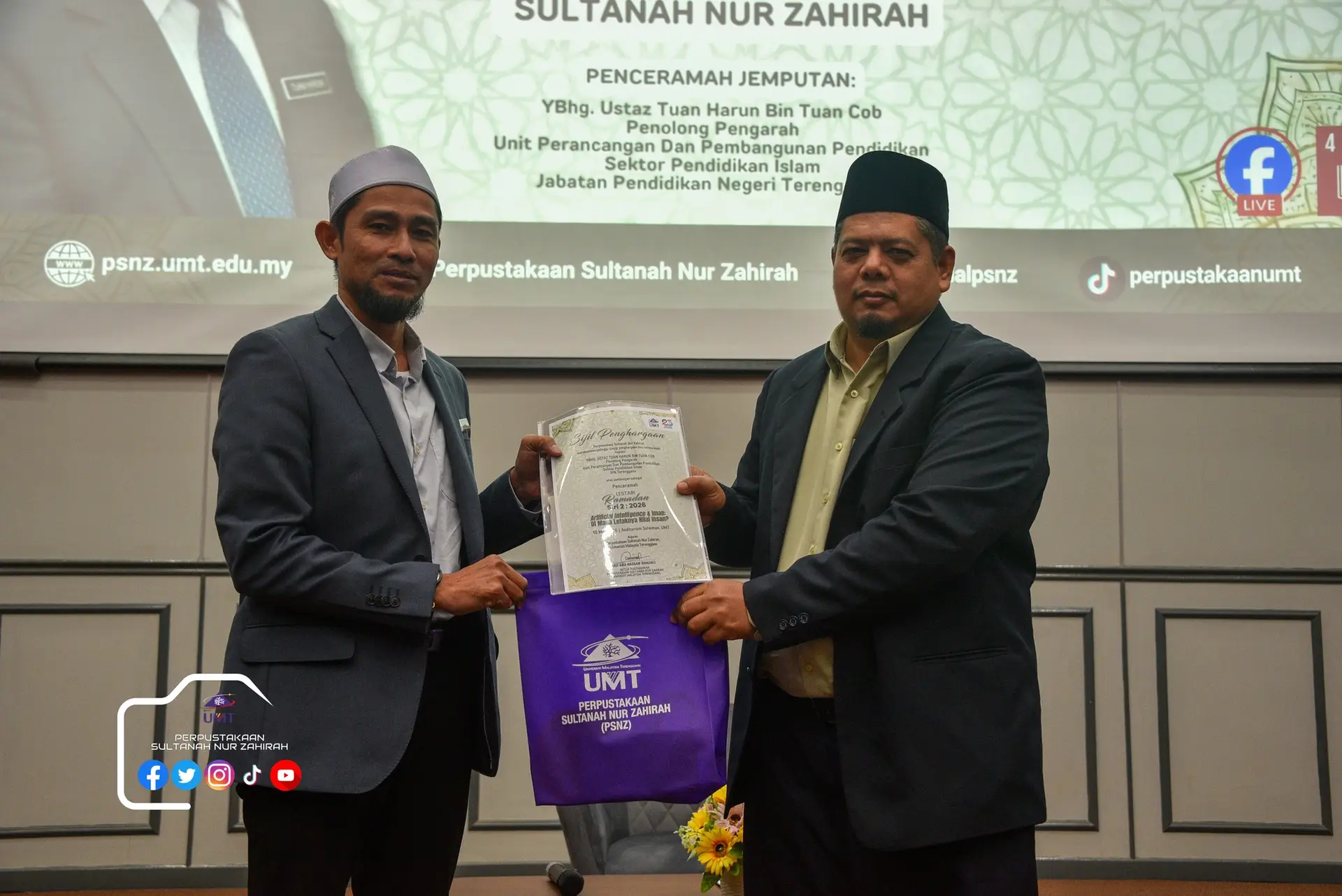 Perpustakaan Sultanah Nur Zahirah telah menganjurkan sebuah program khas sempena kedatangan bulan Ramadan 1447H. Program Lestari Ramadan Siri 2 pada kali ini telah mengundang YBhg. Ustaz Tuan Harun bin Tuan Cob, Penolong Pengarah, Unit Perancangan Dan Pembangunan Pendidikan, Sektor Pendidikan Islam, Jabatan Pendidikan Negeri Terengganu untuk berkongsi ilmu dengan ceramah bertajuk “Artificial Intelligence & Iman: Di Mana Letaknya Nilai Insan?”.