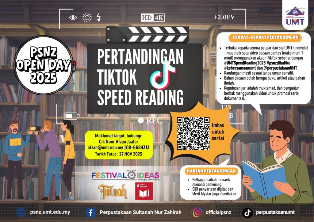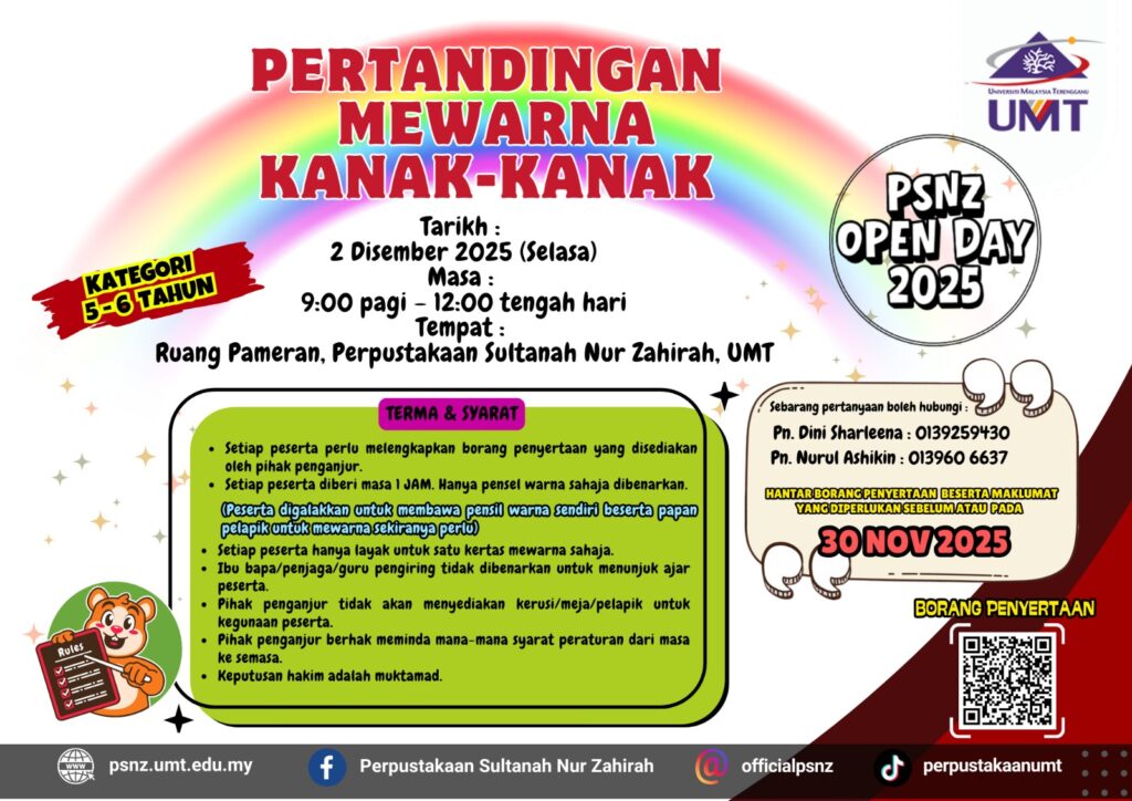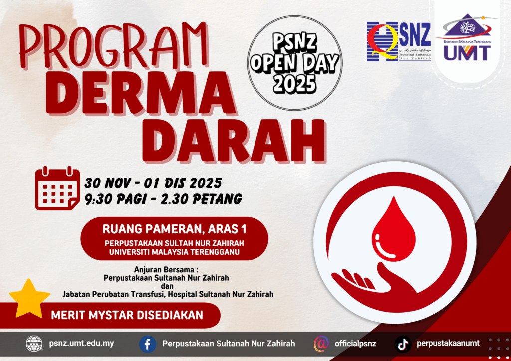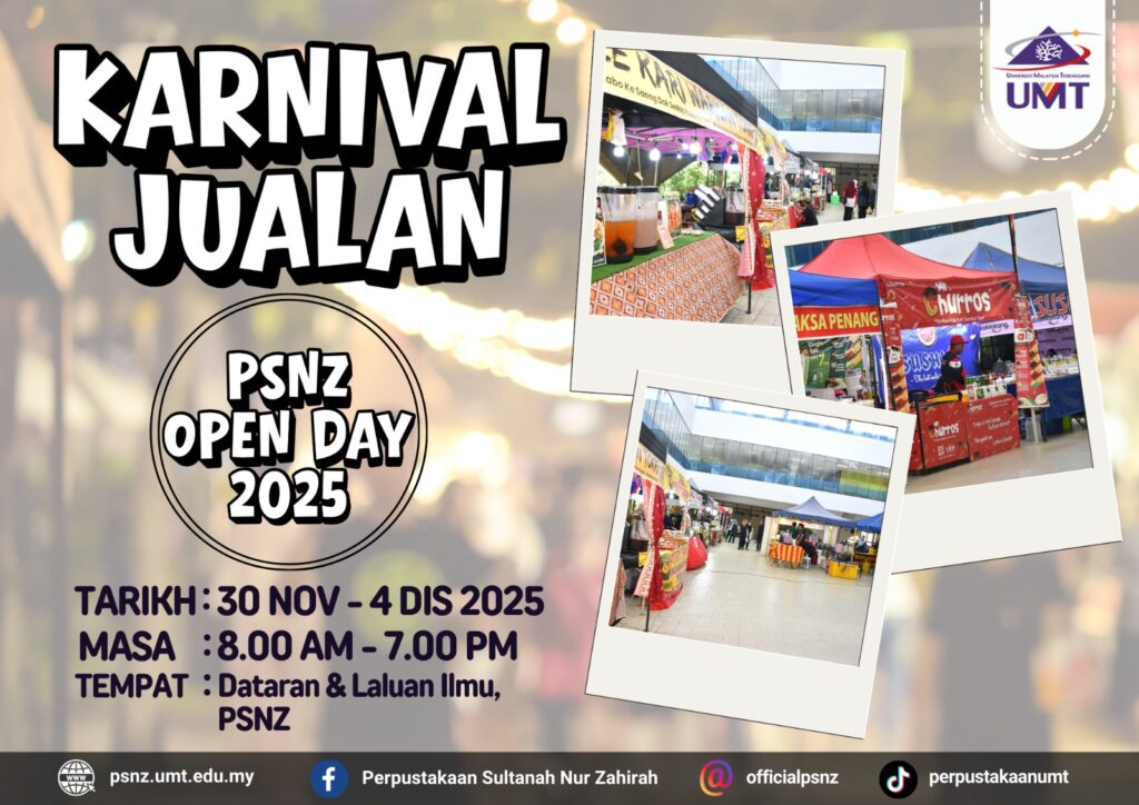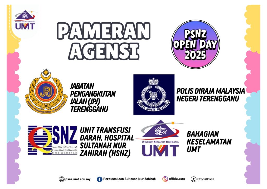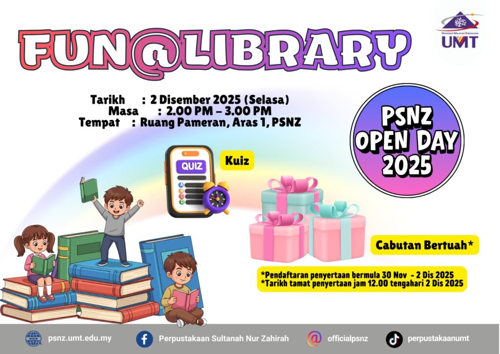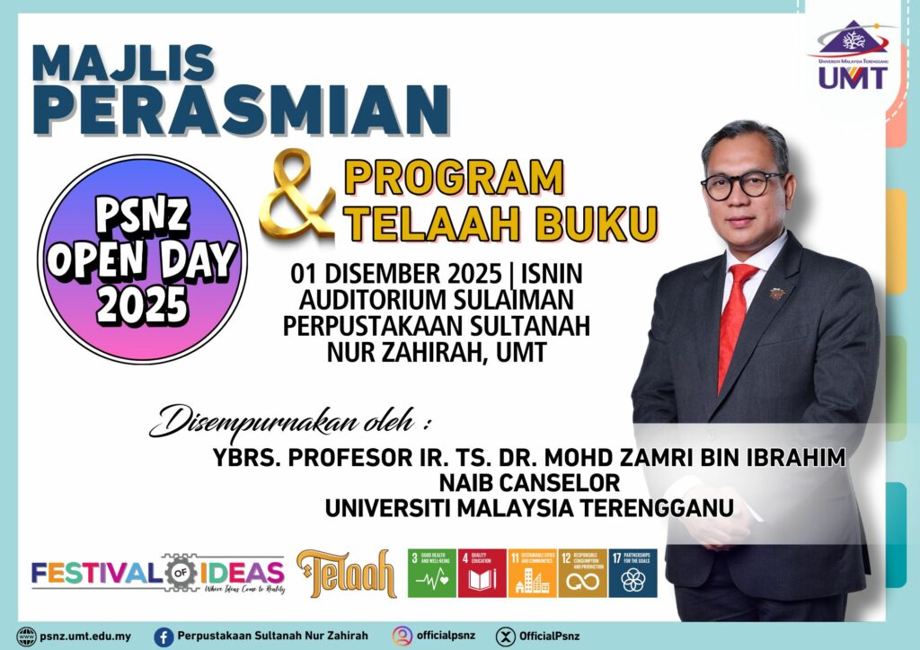 Perpustakaan Sultanah Nur Zahirah akan menganjurkan Hari Bersama Perpustakaan 2025 (PSNZ Open Day 2025). Program ini akan diadakan dengan merujuk butiran berikut: