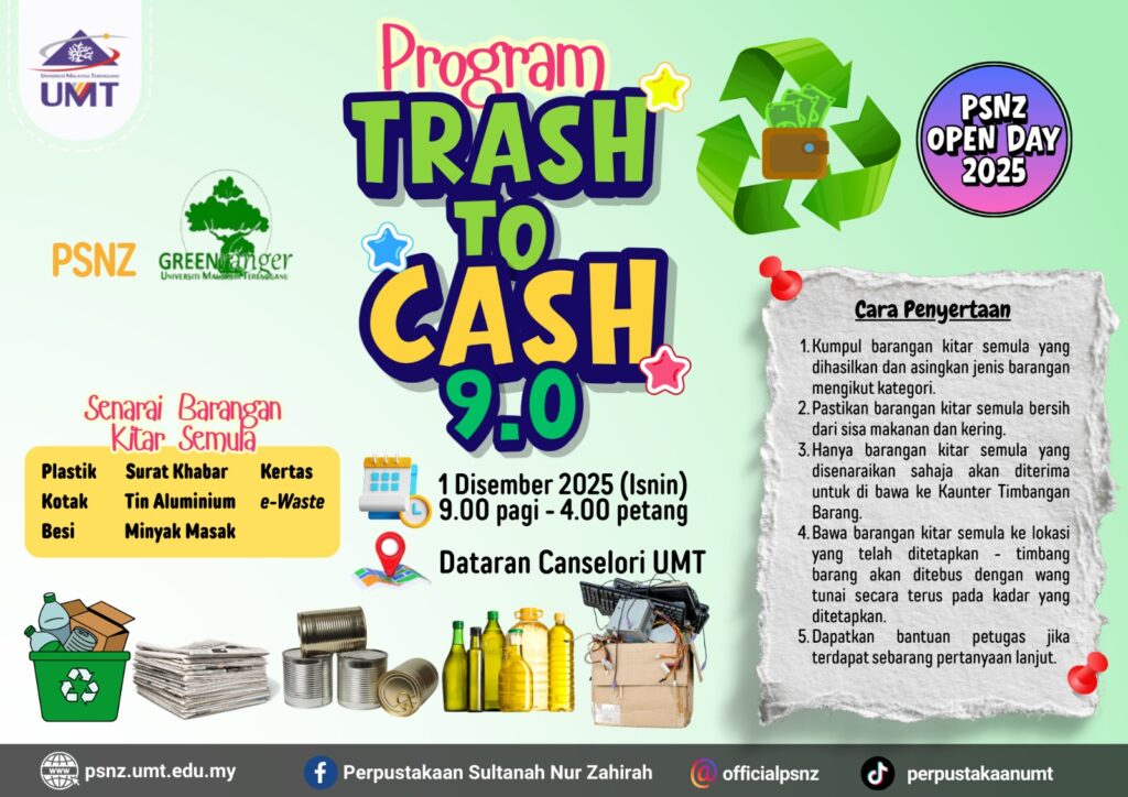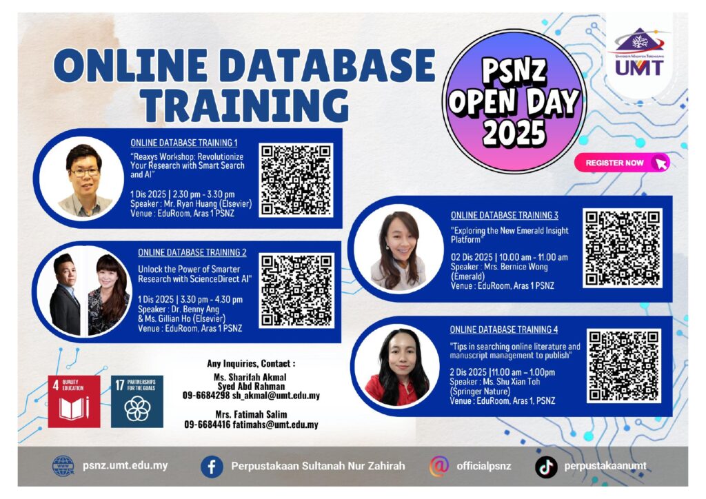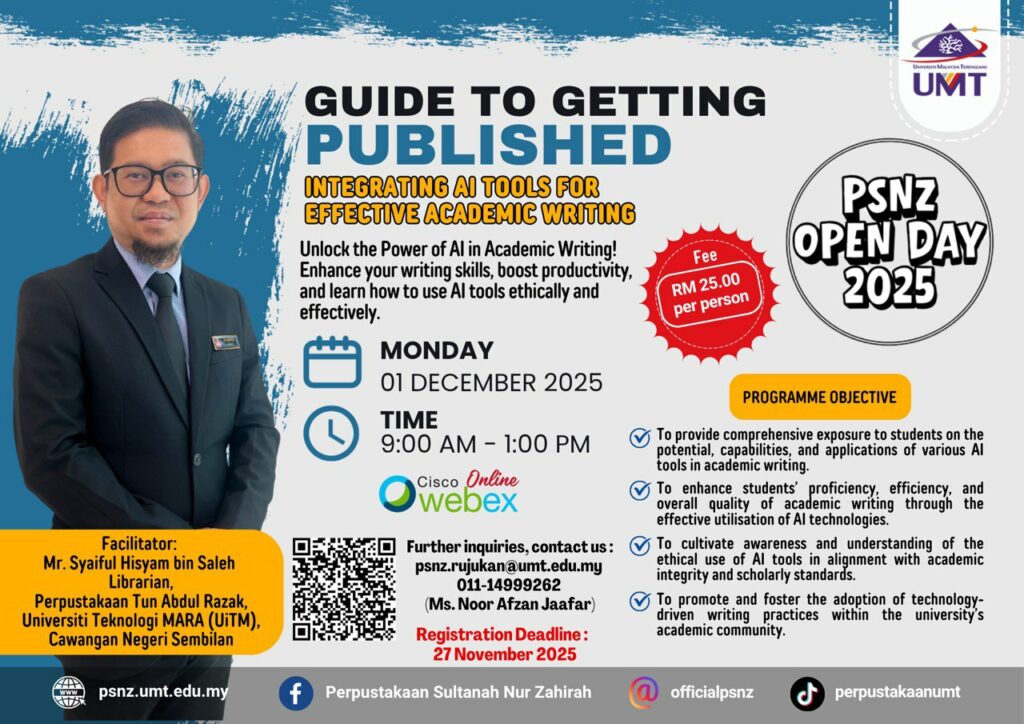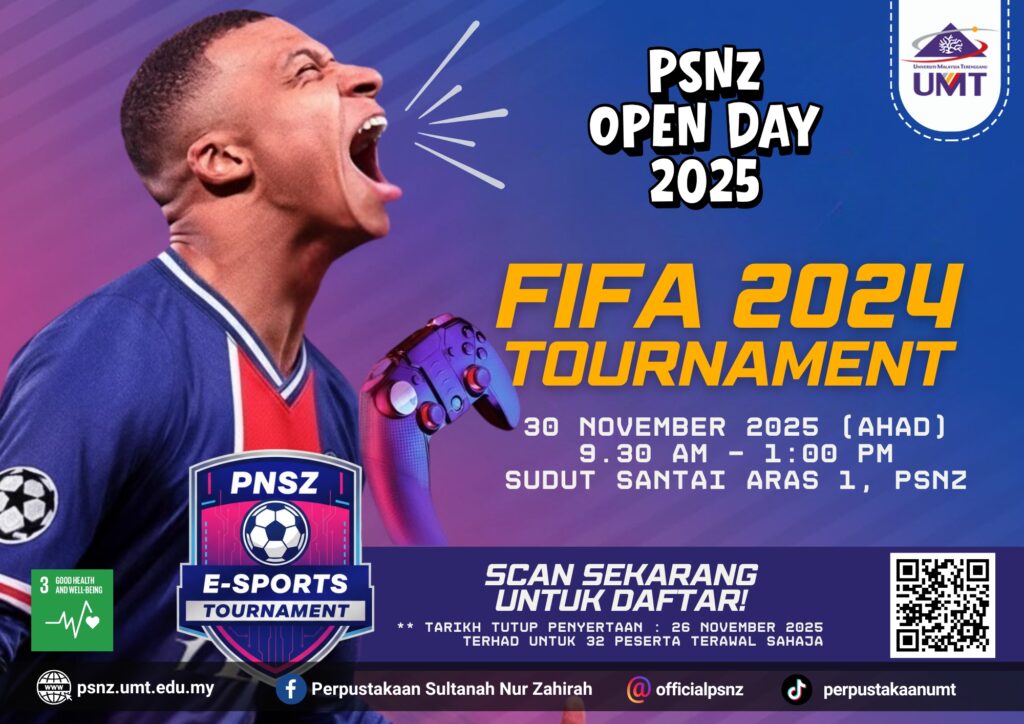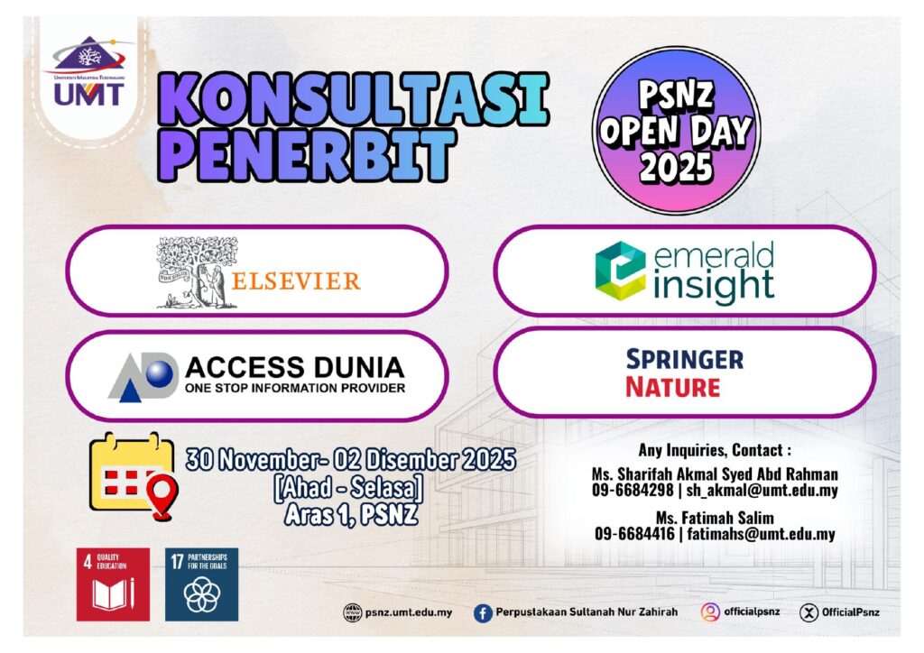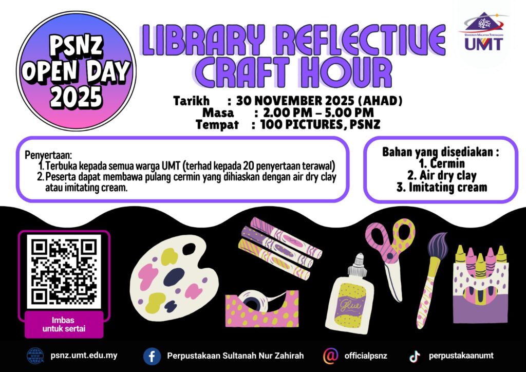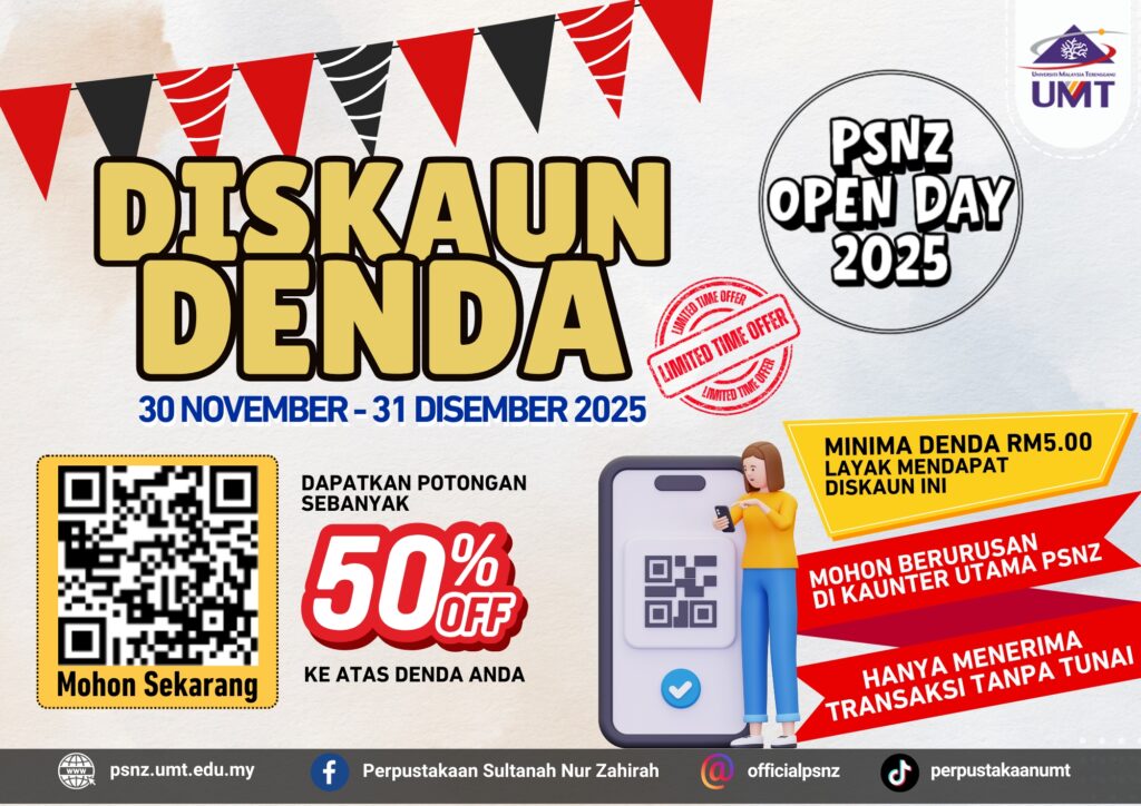 Perpustakaan Sultanah Nur Zahirah akan menganjurkan Hari Bersama Perpustakaan 2025 (PSNZ Open Day 2025). Program ini akan diadakan dengan merujuk butiran berikut: