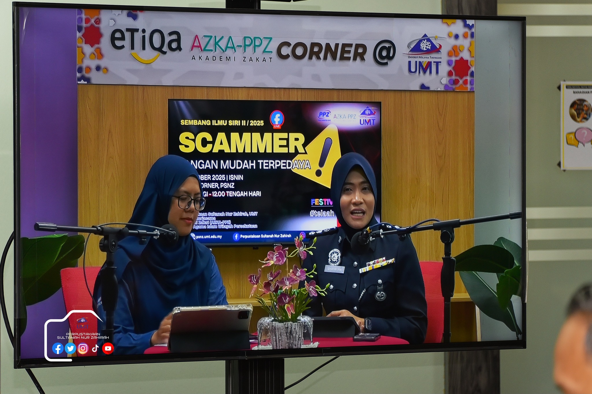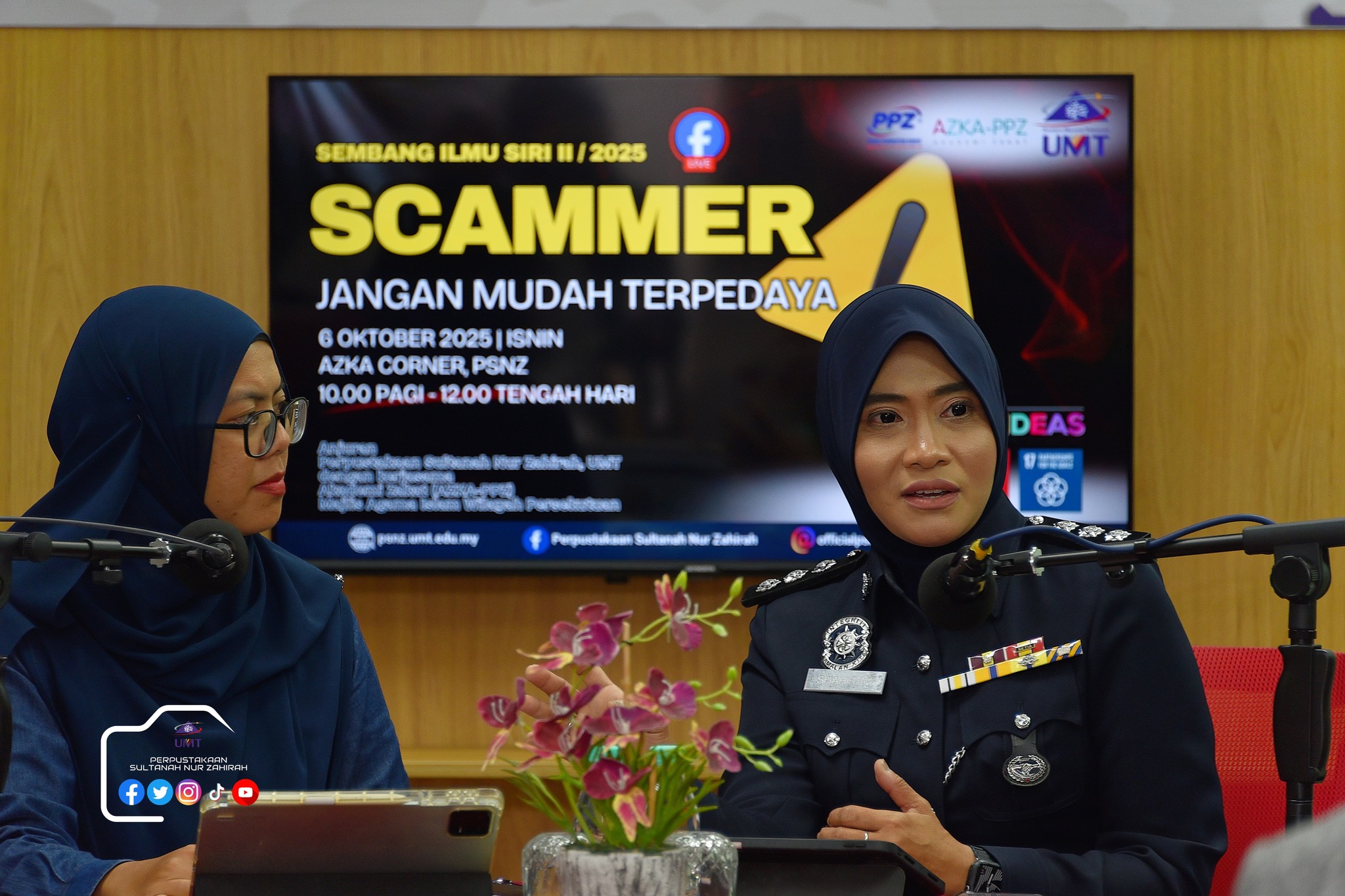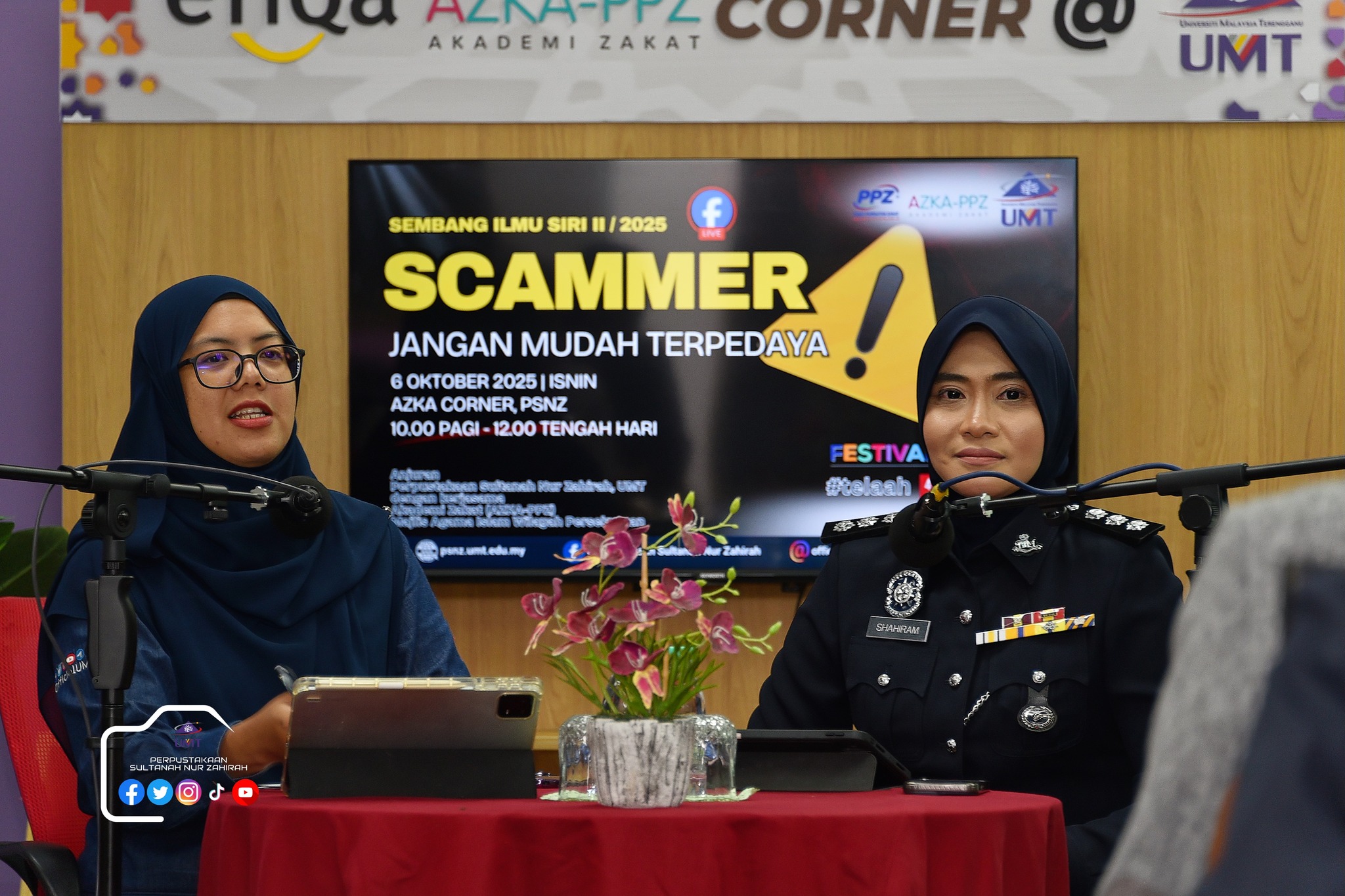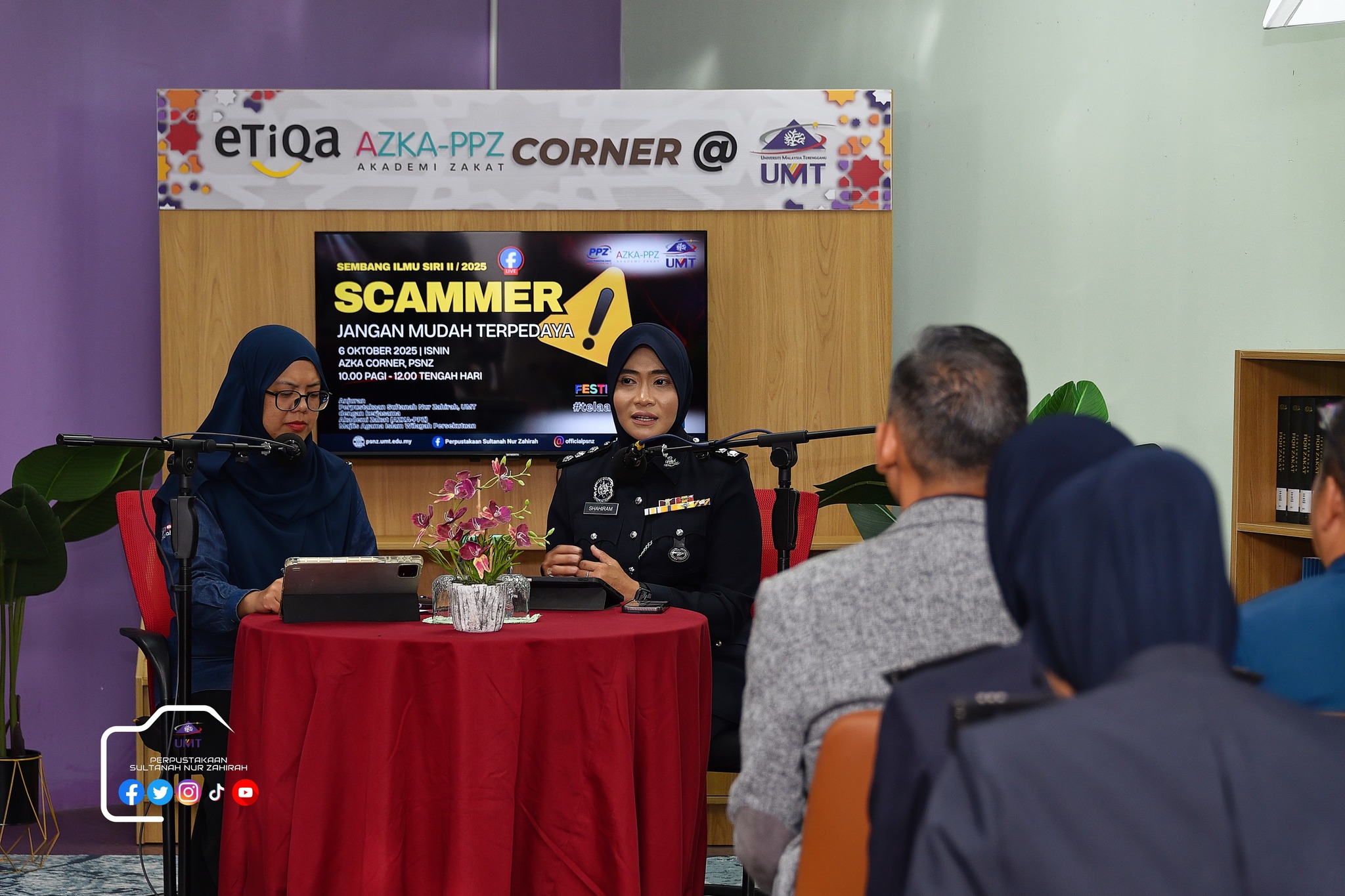 Perpustakaan Sultanah Nur Zahirah (PSNZ), Universiti Malaysia Terengganu dengan Kerjasama AZKA-PPZ MAIWP telah menganjurkan program bual bicara bertajuk “Scammer: Jangan Mudah Terpedaya!” bagi memberi kesedaran kepada warga kampus dan komuniti sekitar tentang ancaman penipuan dalam talian yang semakin membimbangkan. Program kali ini menampilkan ASP Noorshahiram binti Adam daripada Bahagian Siasatan Jenayah Komersil, IPD Kuala Terengganu sebagai panel jemputan, bersama Puan Wan Najihah binti Wan Muhammad, pustakawan PSNZ sebagai moderator.