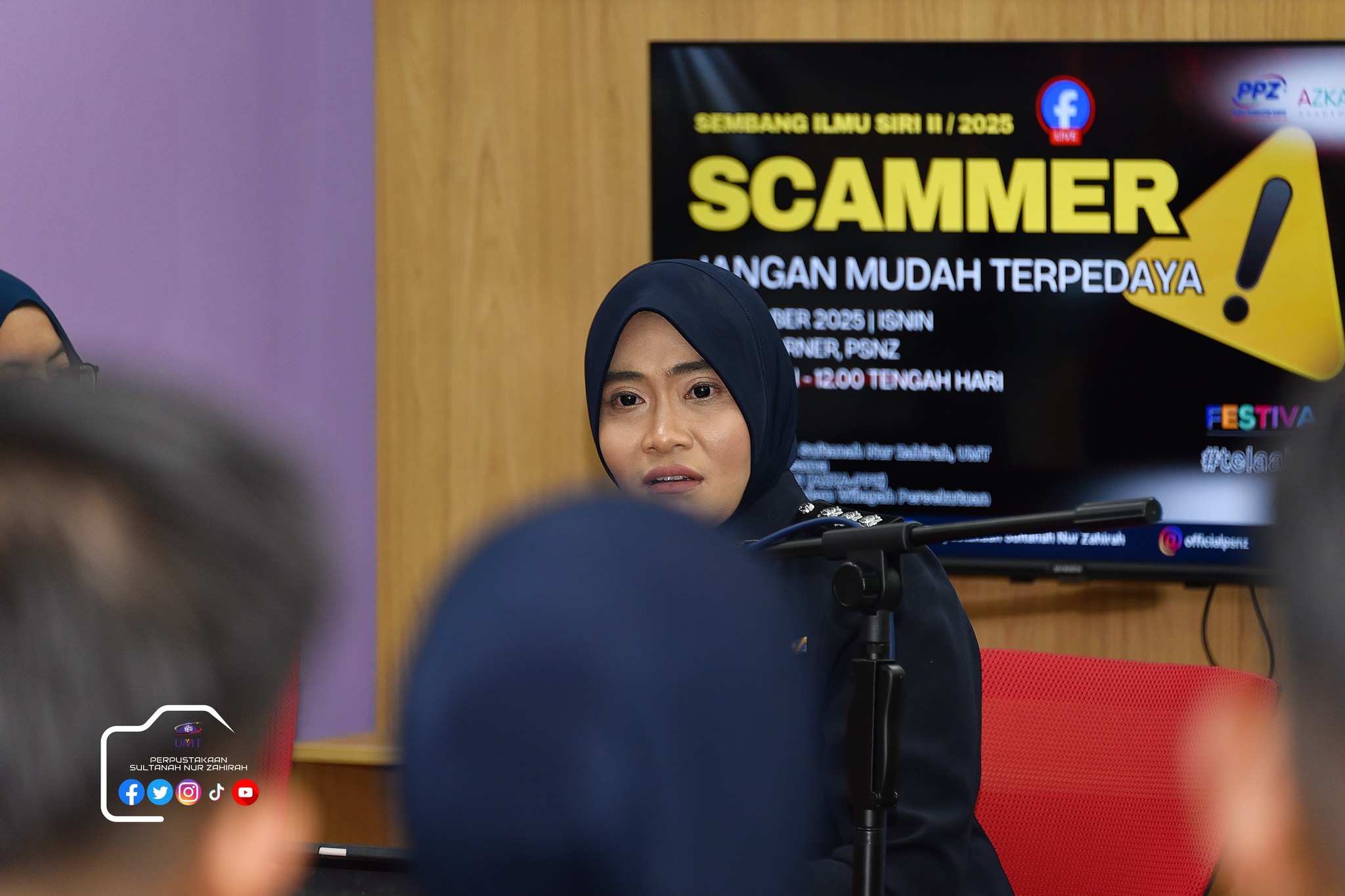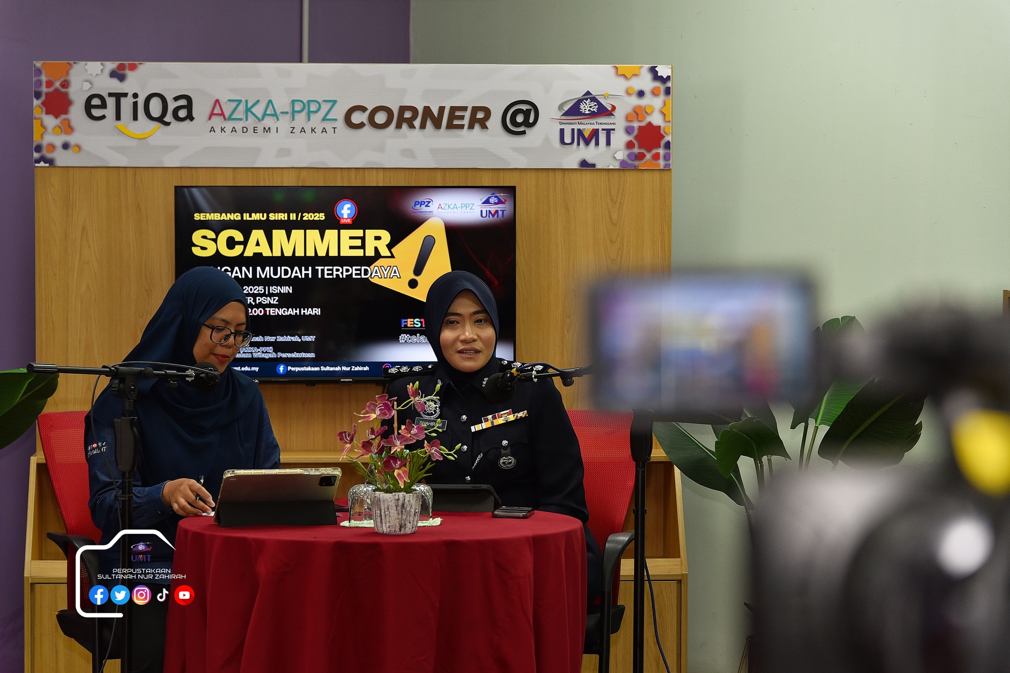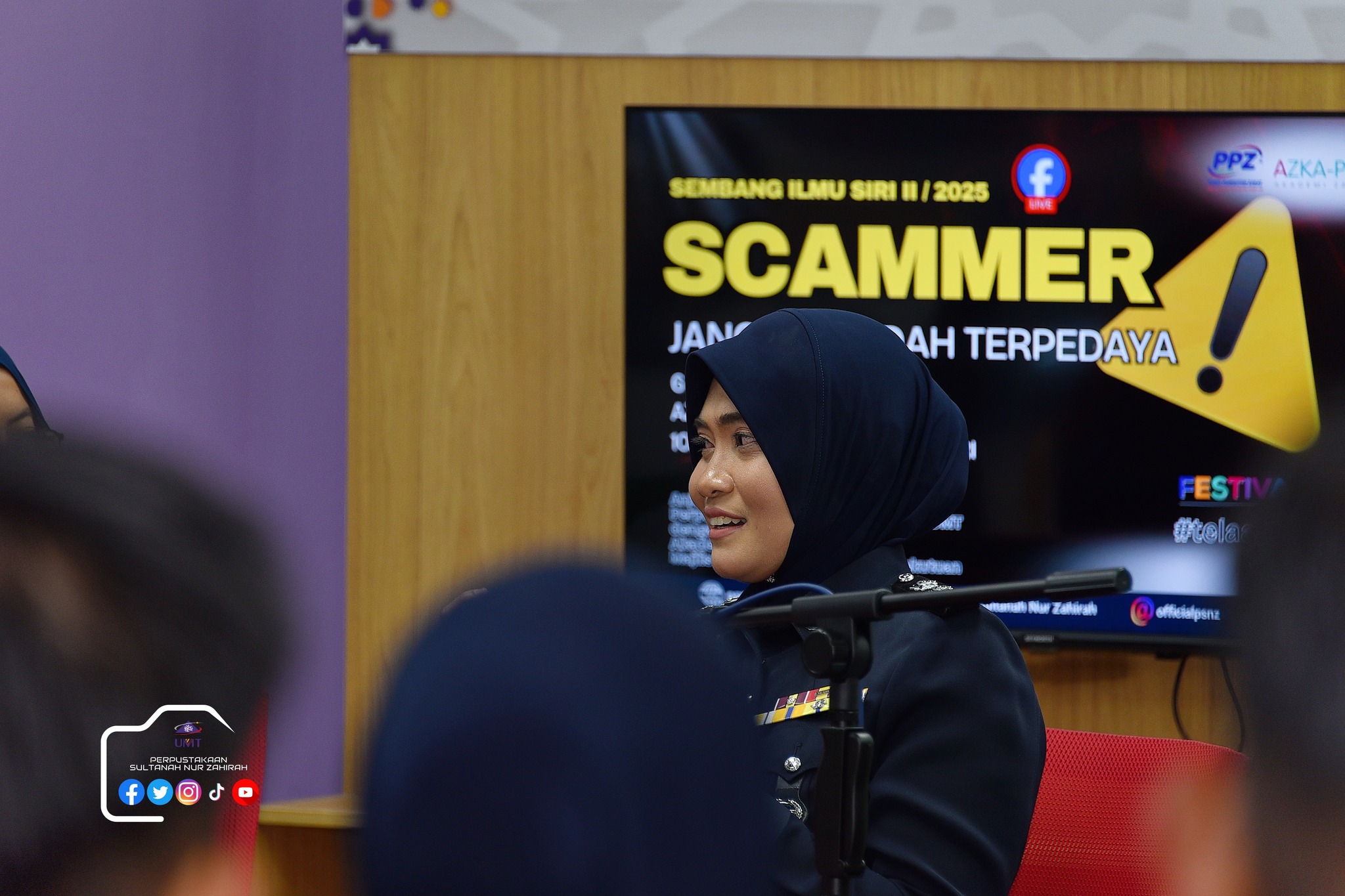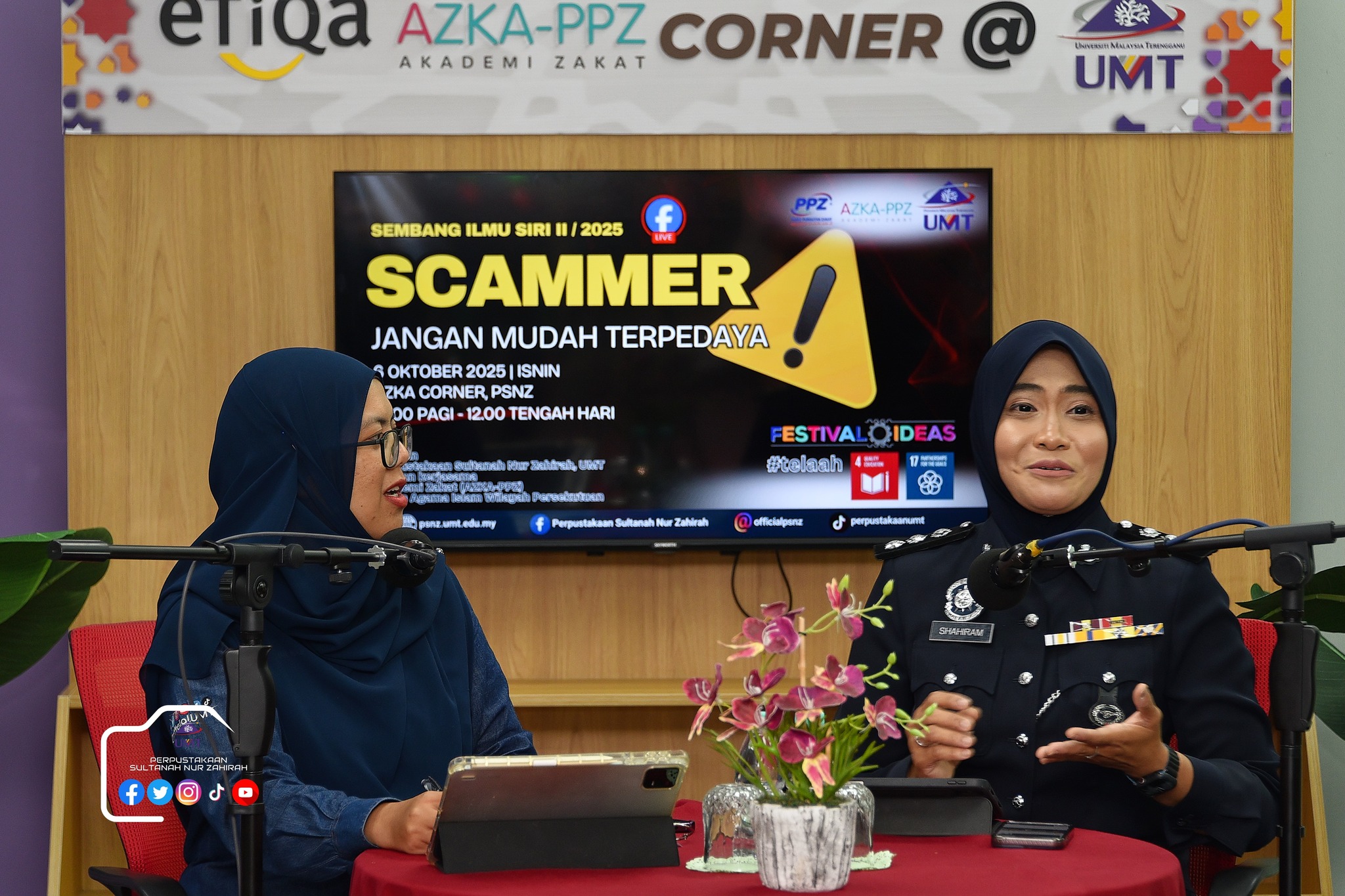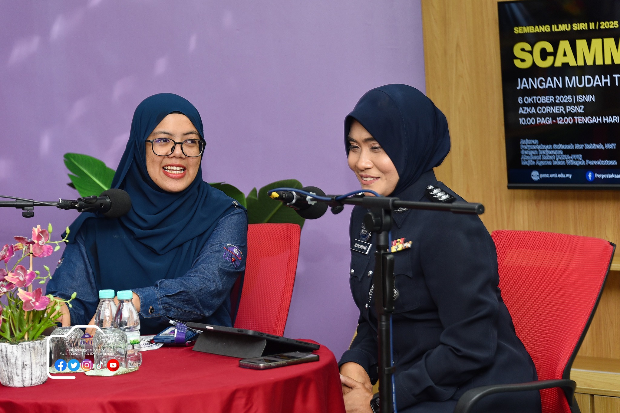 Perpustakaan Sultanah Nur Zahirah (PSNZ), Universiti Malaysia Terengganu dengan Kerjasama AZKA-PPZ MAIWP telah menganjurkan program bual bicara bertajuk “Scammer: Jangan Mudah Terpedaya!” bagi memberi kesedaran kepada warga kampus dan komuniti sekitar tentang ancaman penipuan dalam talian yang semakin membimbangkan. Program kali ini menampilkan ASP Noorshahiram binti Adam daripada Bahagian Siasatan Jenayah Komersil, IPD Kuala Terengganu sebagai panel jemputan, bersama Puan Wan Najihah binti Wan Muhammad, pustakawan PSNZ sebagai moderator.