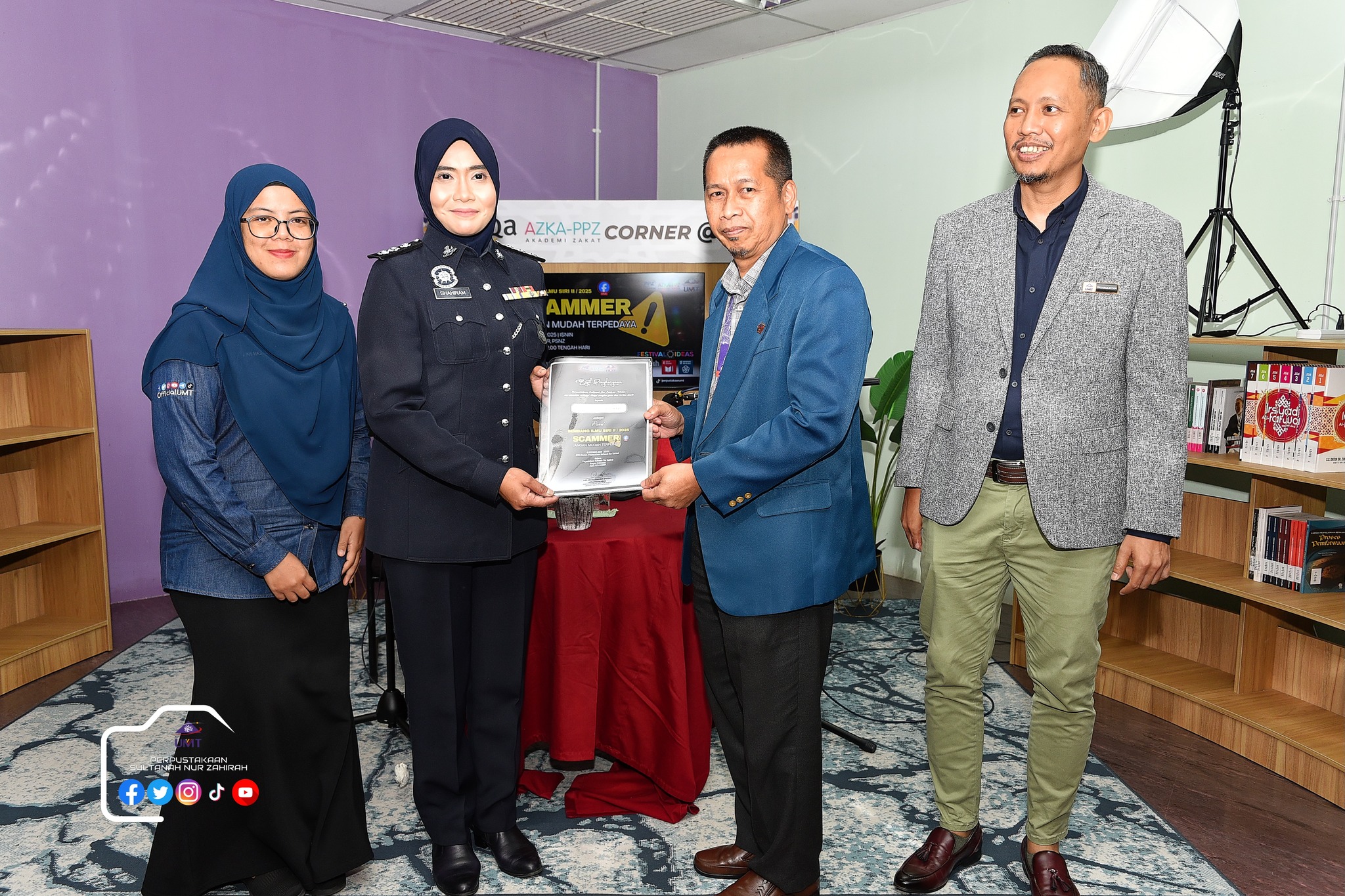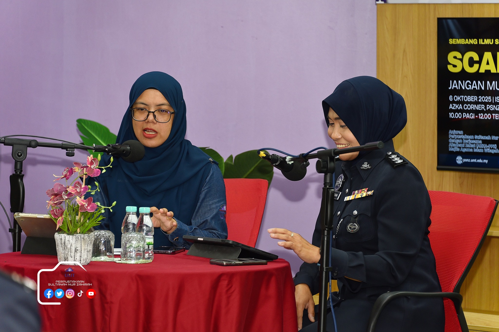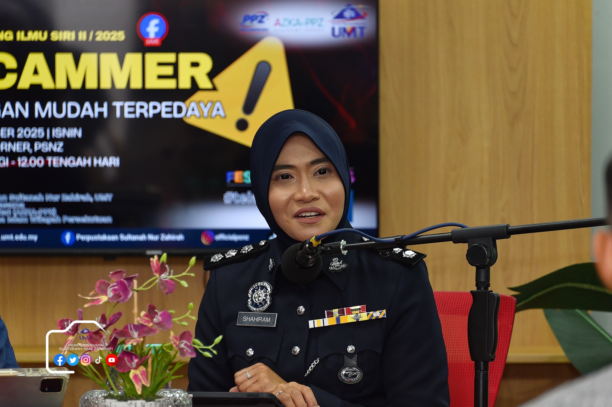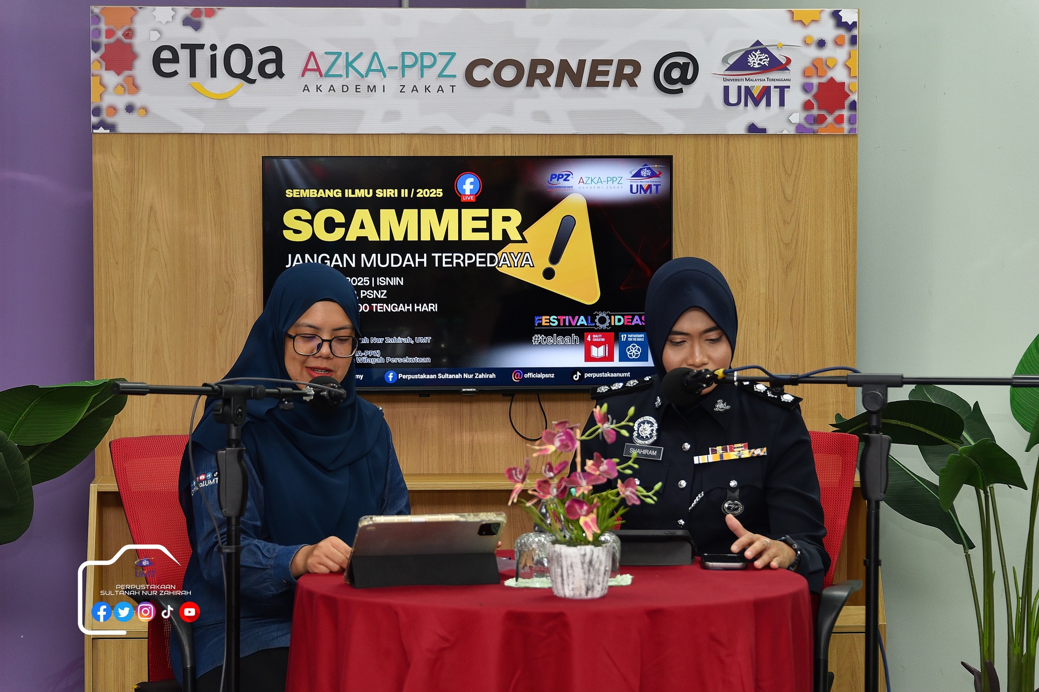 Perpustakaan Sultanah Nur Zahirah (PSNZ), Universiti Malaysia Terengganu dengan Kerjasama AZKA-PPZ MAIWP telah menganjurkan program bual bicara bertajuk “Scammer: Jangan Mudah Terpedaya!” bagi memberi kesedaran kepada warga kampus dan komuniti sekitar tentang ancaman penipuan dalam talian yang semakin membimbangkan. Program kali ini menampilkan ASP Noorshahiram binti Adam daripada Bahagian Siasatan Jenayah Komersil, IPD Kuala Terengganu sebagai panel jemputan, bersama Puan Wan Najihah binti Wan Muhammad, pustakawan PSNZ sebagai moderator.