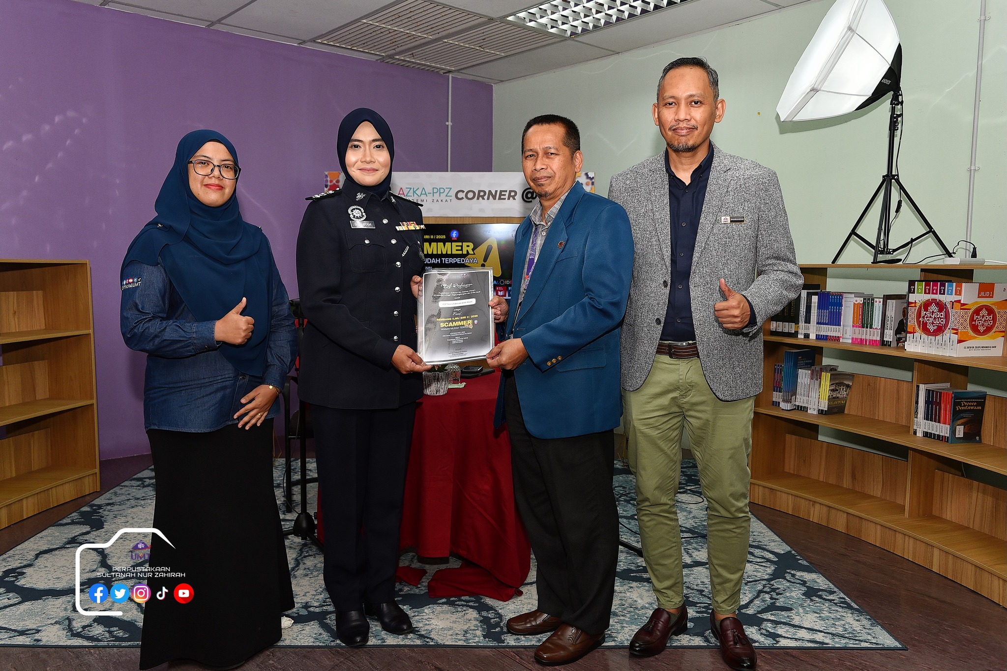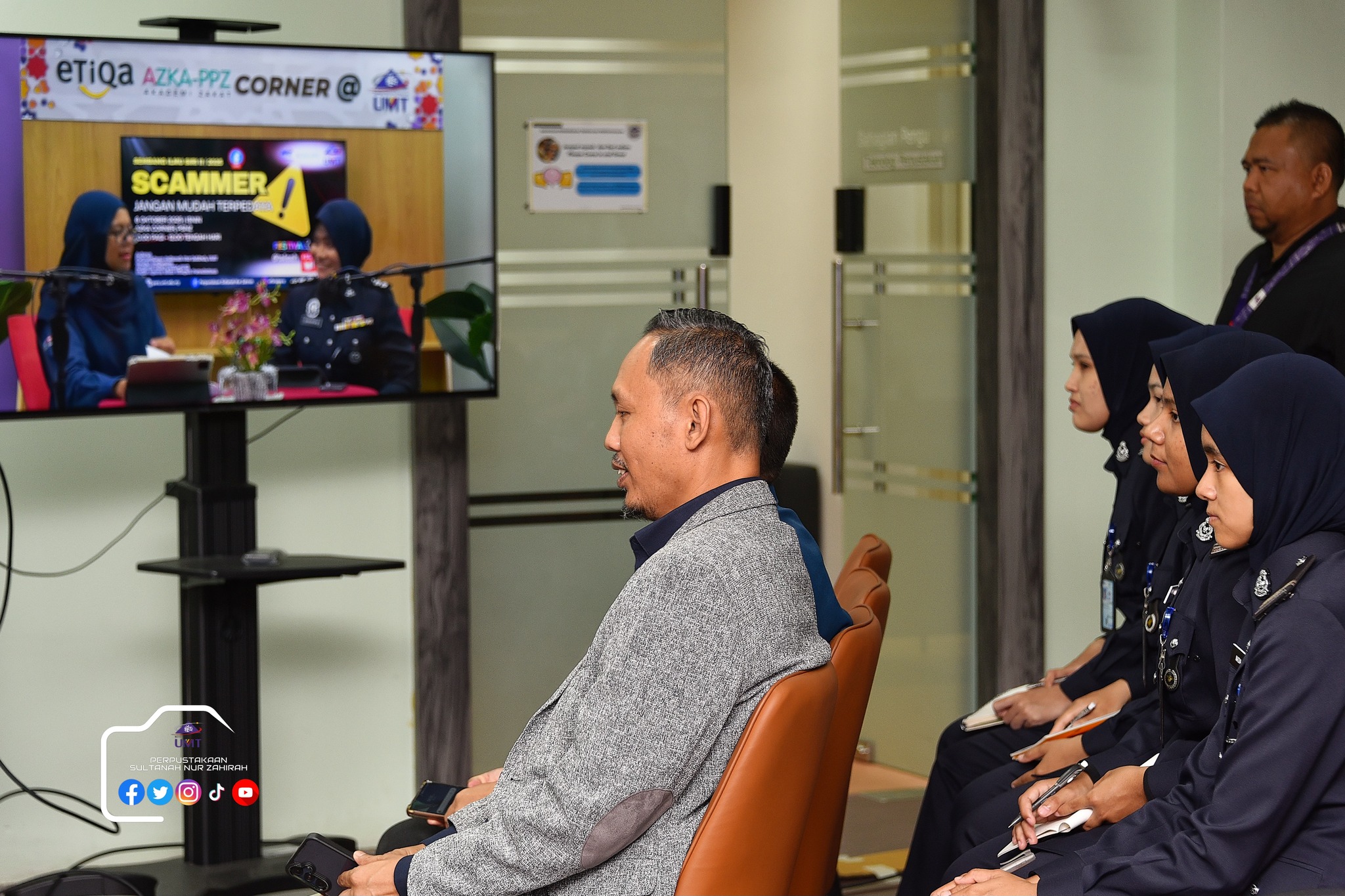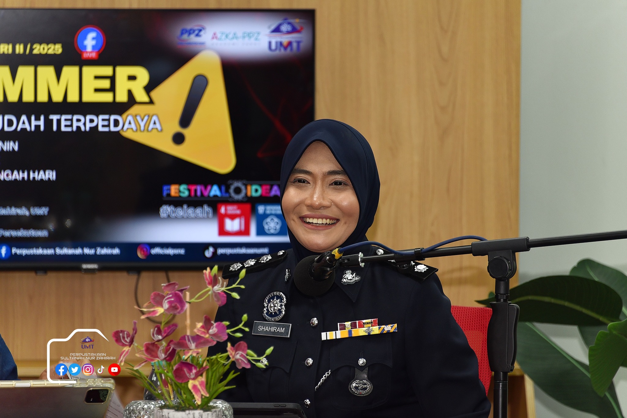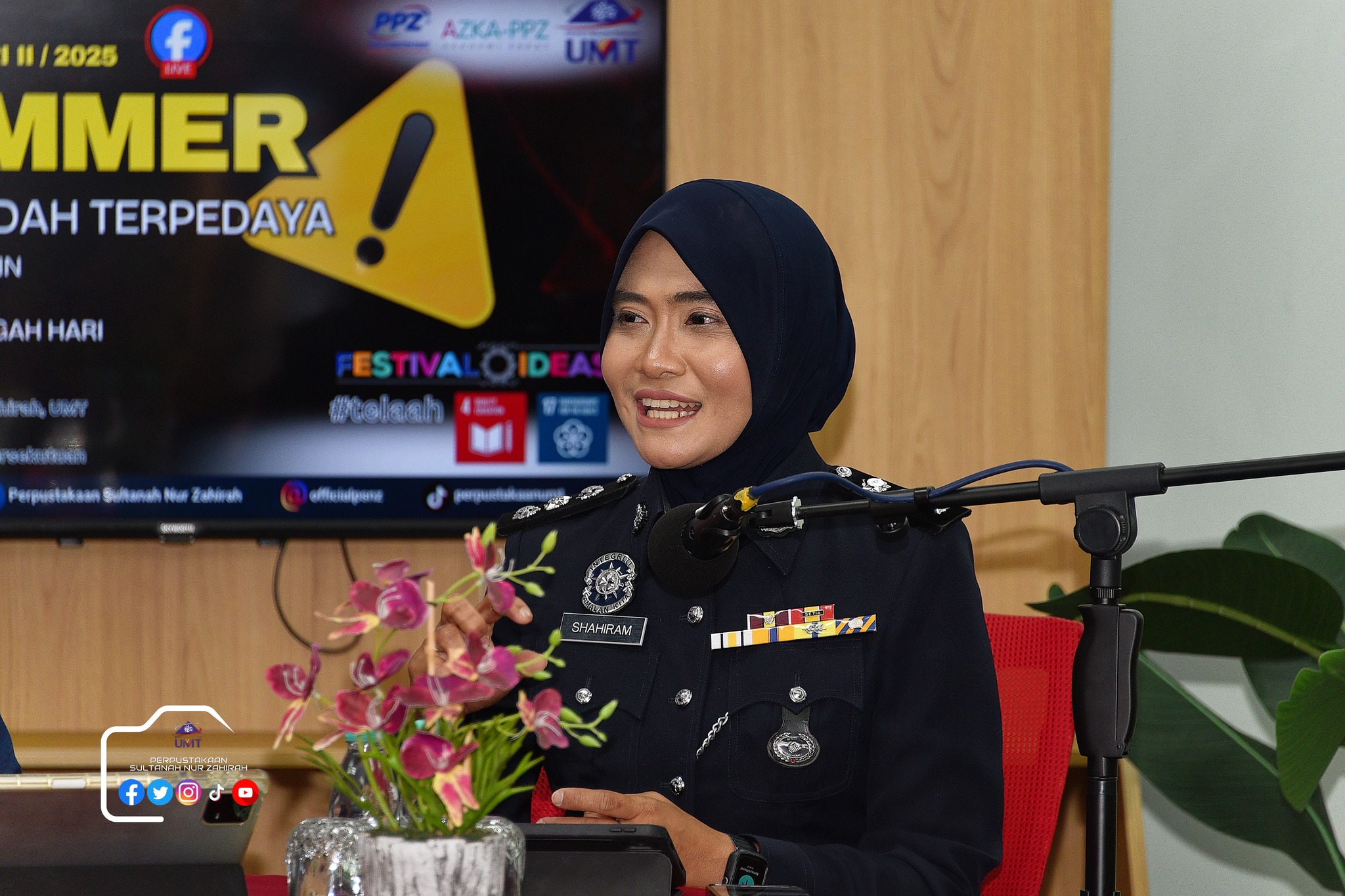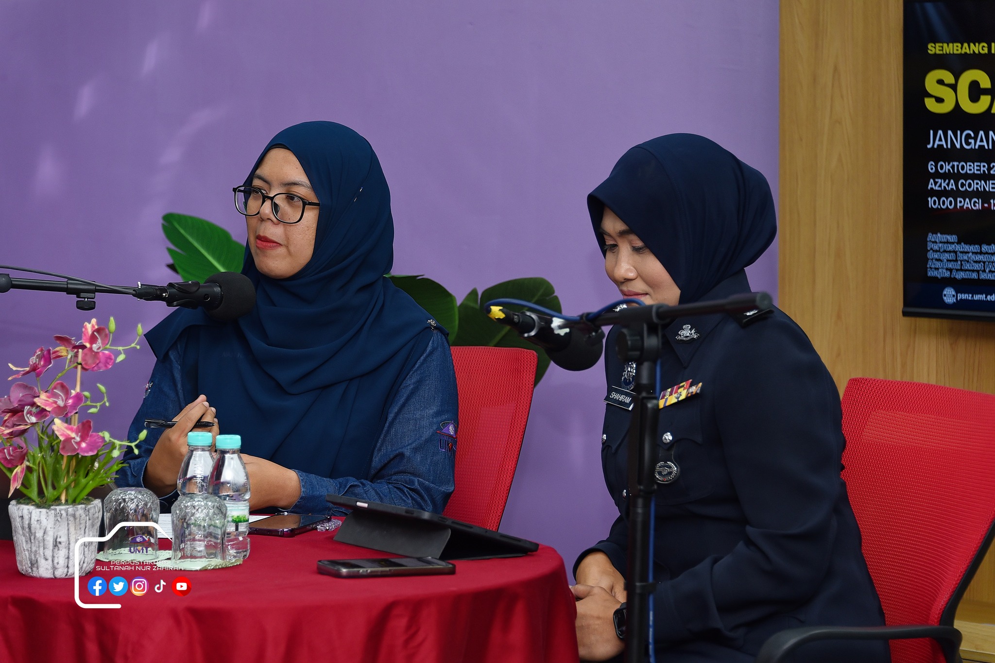 Perpustakaan Sultanah Nur Zahirah (PSNZ), Universiti Malaysia Terengganu dengan Kerjasama AZKA-PPZ MAIWP telah menganjurkan program bual bicara bertajuk “Scammer: Jangan Mudah Terpedaya!” bagi memberi kesedaran kepada warga kampus dan komuniti sekitar tentang ancaman penipuan dalam talian yang semakin membimbangkan. Program kali ini menampilkan ASP Noorshahiram binti Adam daripada Bahagian Siasatan Jenayah Komersil, IPD Kuala Terengganu sebagai panel jemputan, bersama Puan Wan Najihah binti Wan Muhammad, pustakawan PSNZ sebagai moderator.