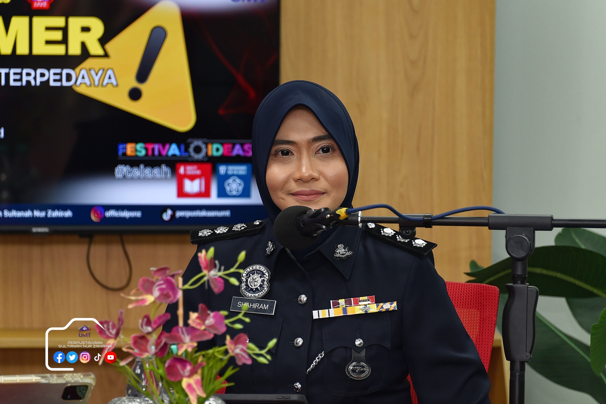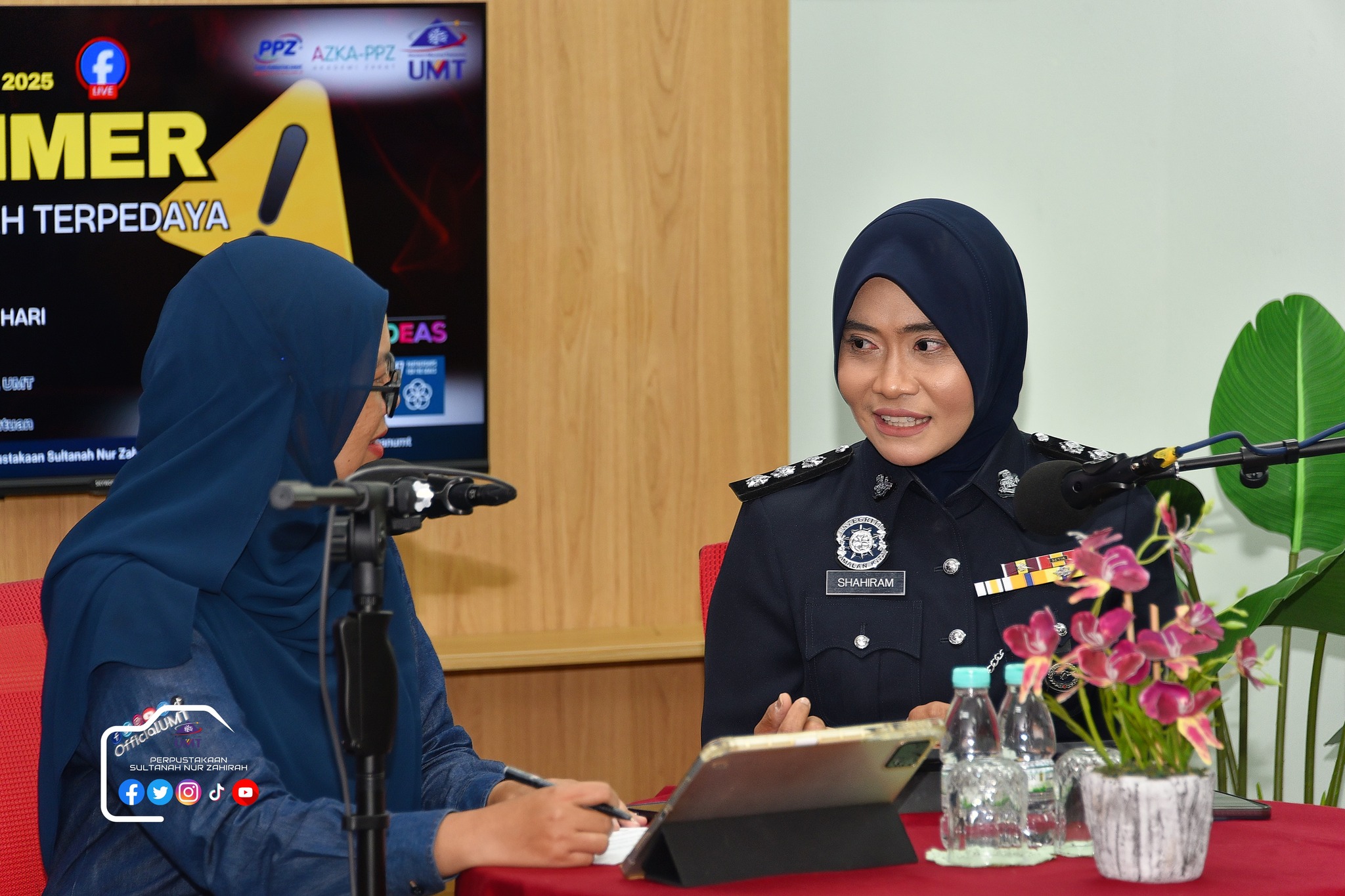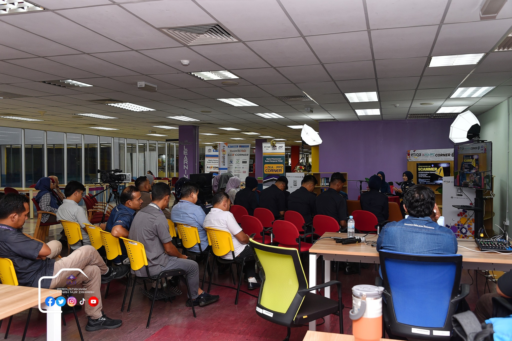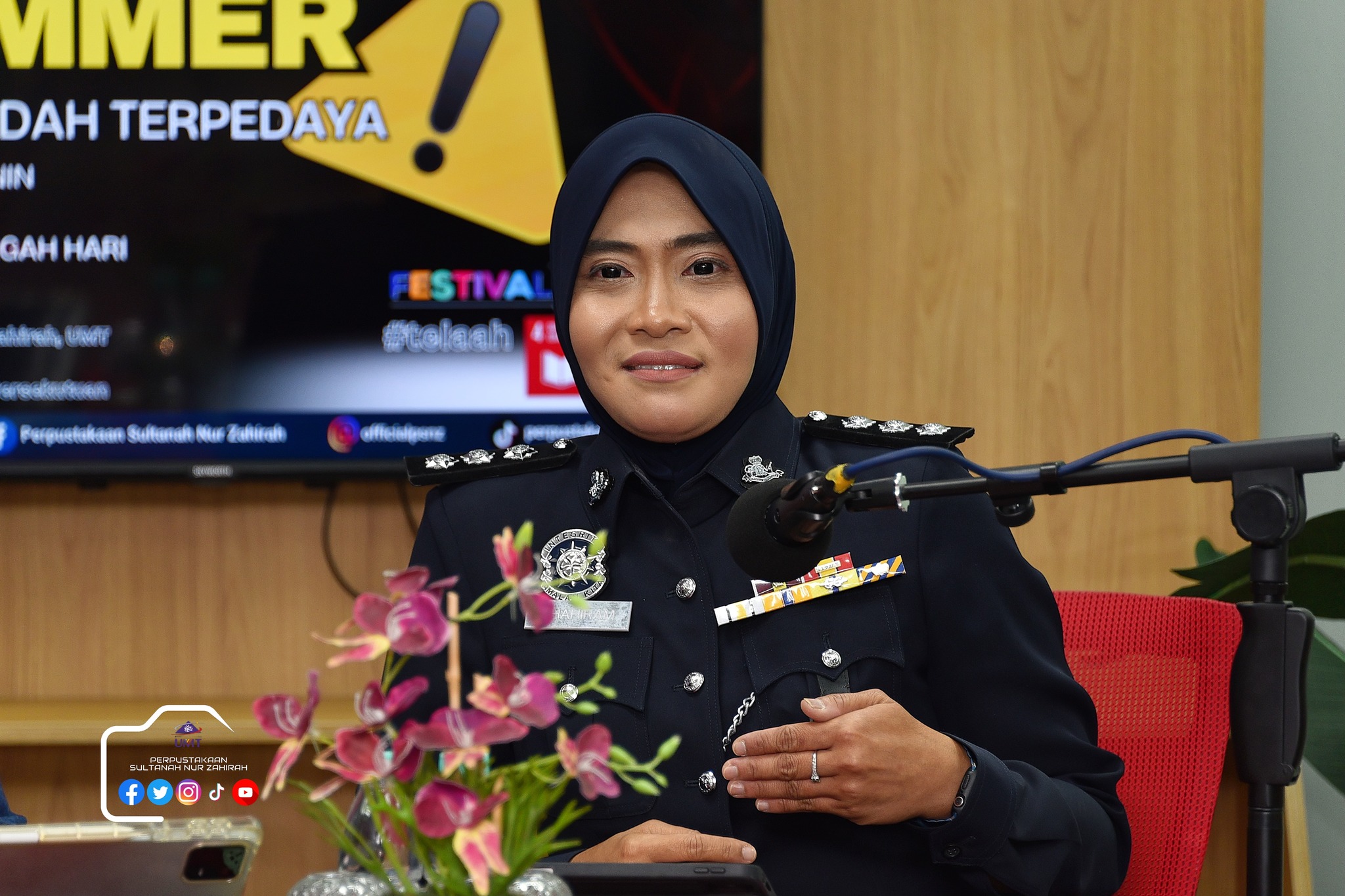 Perpustakaan Sultanah Nur Zahirah (PSNZ), Universiti Malaysia Terengganu dengan Kerjasama AZKA-PPZ MAIWP telah menganjurkan program bual bicara bertajuk “Scammer: Jangan Mudah Terpedaya!” bagi memberi kesedaran kepada warga kampus dan komuniti sekitar tentang ancaman penipuan dalam talian yang semakin membimbangkan. Program kali ini menampilkan ASP Noorshahiram binti Adam daripada Bahagian Siasatan Jenayah Komersil, IPD Kuala Terengganu sebagai panel jemputan, bersama Puan Wan Najihah binti Wan Muhammad, pustakawan PSNZ sebagai moderator.